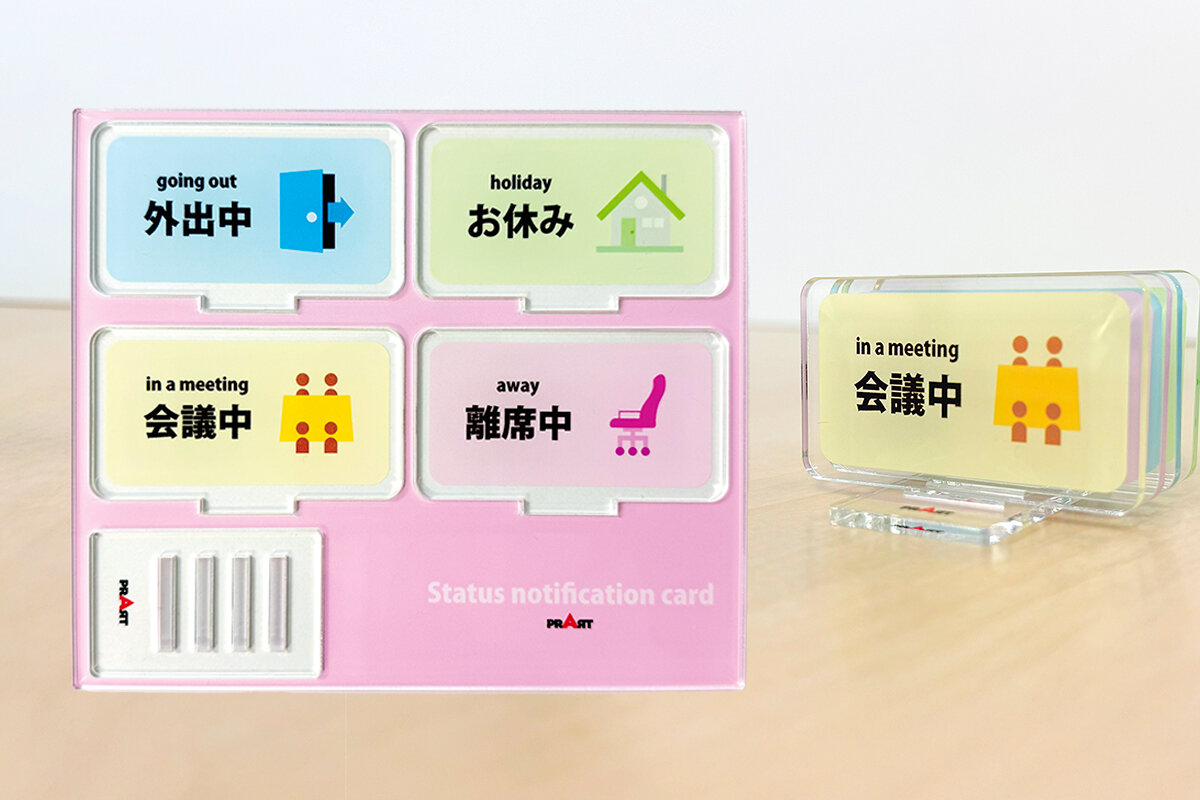 会議中、外出中、お休み、離席中の4パターンで状態を表示できます。